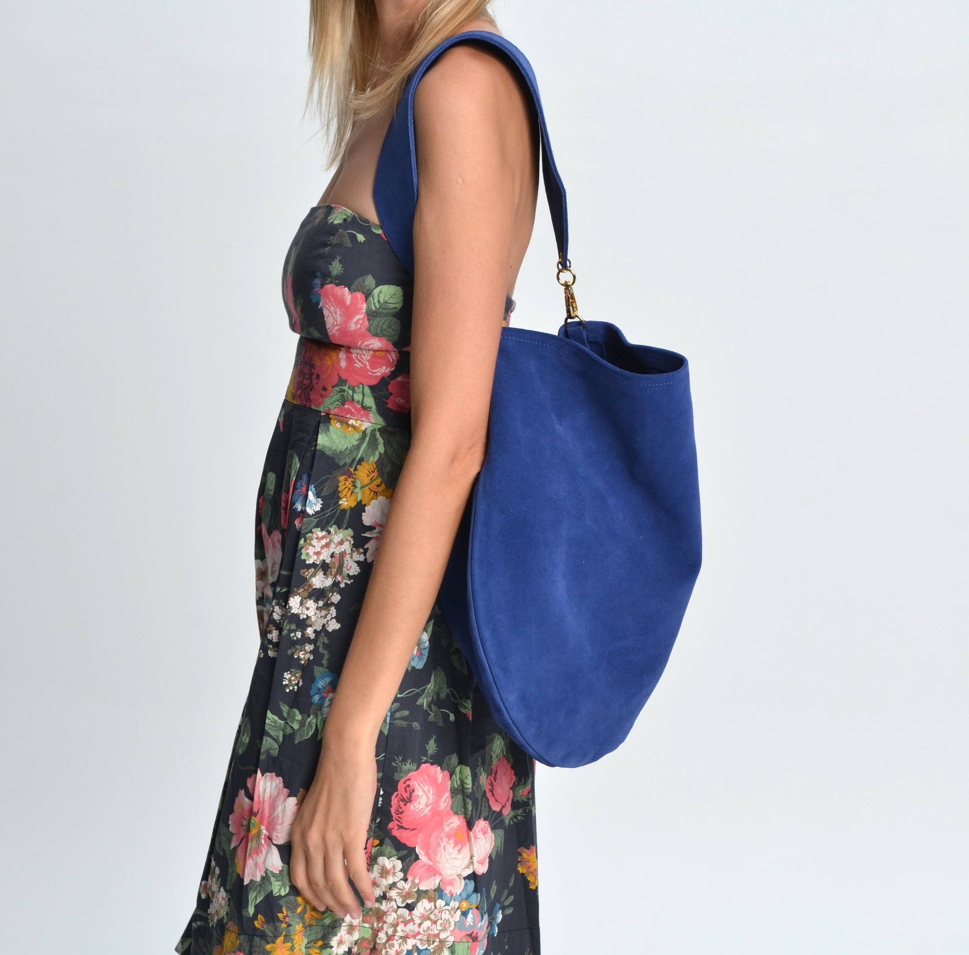 A beautiful large hobo bag which is ideal for every day use. Not just a shoulder bag, a statetment tote which can easily be used as a shopper bag. It's loose minimalistic look makes it modern and unique. Handmade in our studio from lux italian suede leather in blue. A leather pocket made from suede leather is included at the interior.