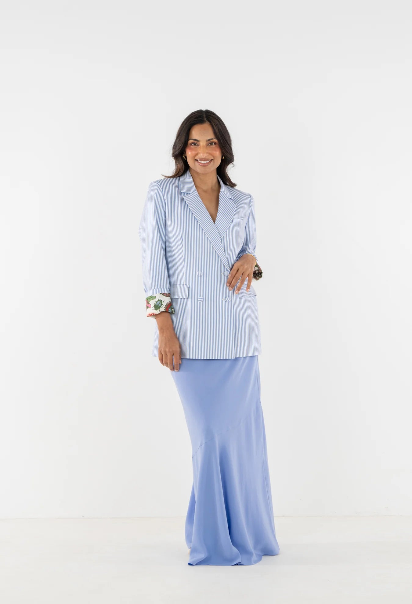 The Bristol Blazer in Grapemist Stripe is a modern take on a timeless classic. Designed with a relaxed yet slightly tailored silhouette, this double-breasted style features a classic lapel and clean lines for an effortlessly polished look. Inside, the blazer is lined with our iconic Joy print—revealed with a simple roll of the sleeve for an unexpected pop of playful, signature detail. Versatile by design, it transitions seamlessly from office-ready polish to casual days styled with denim or sneakers, making it a standout staple with personality.