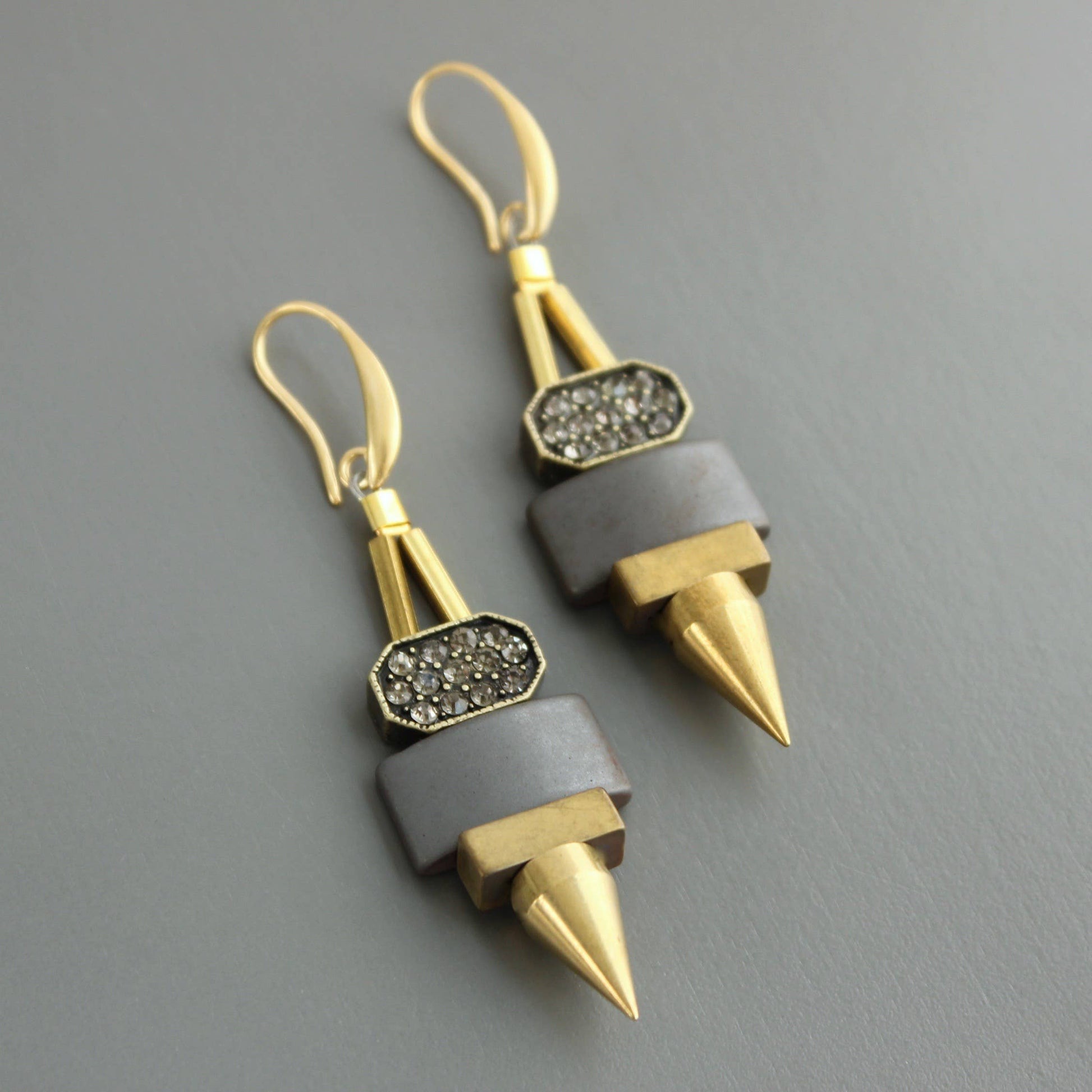 18k gold plated brass hooks with rhinestones, hematite, and brass. 2 7/8 inches from top of hook.
