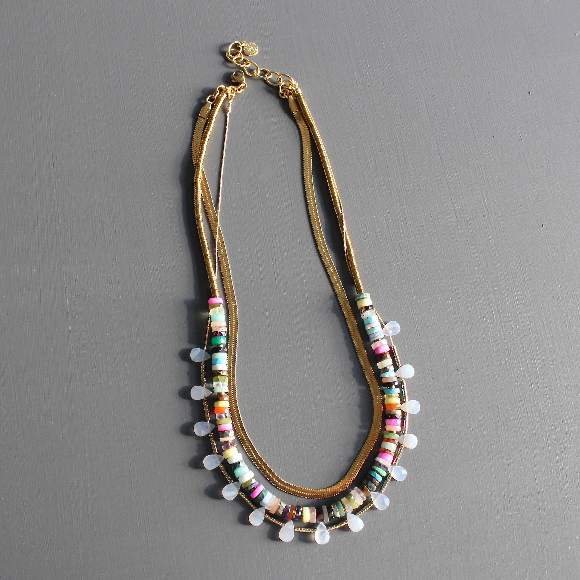 17” triple strand necklace with 18k matte gold plated herringbone and snake chain, stone discs, hematite, and agate teardrops. 2 inch extender.