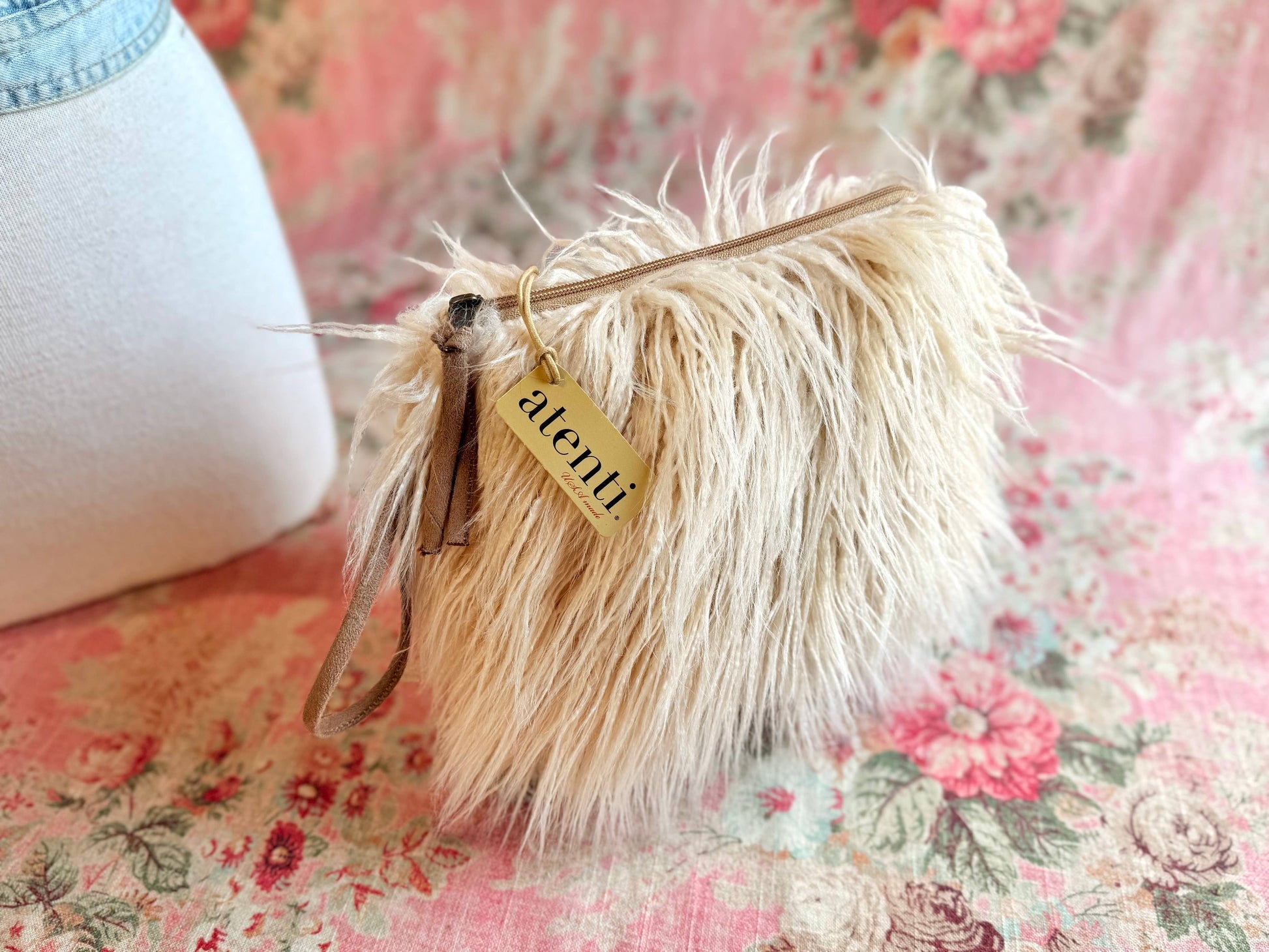 This plush Atenti zipper pouch is handmade in the USA from silky faux fur with a suede wrist strap. A customer favorite for winter displays, holiday gifting, and upscale boutiques.