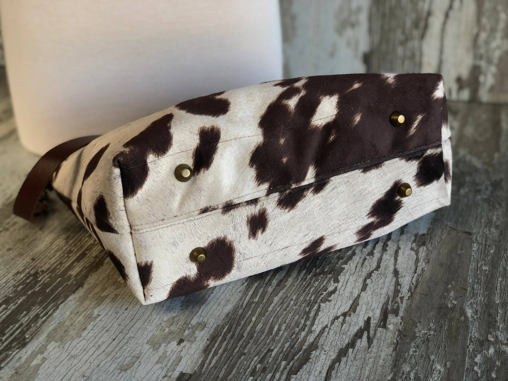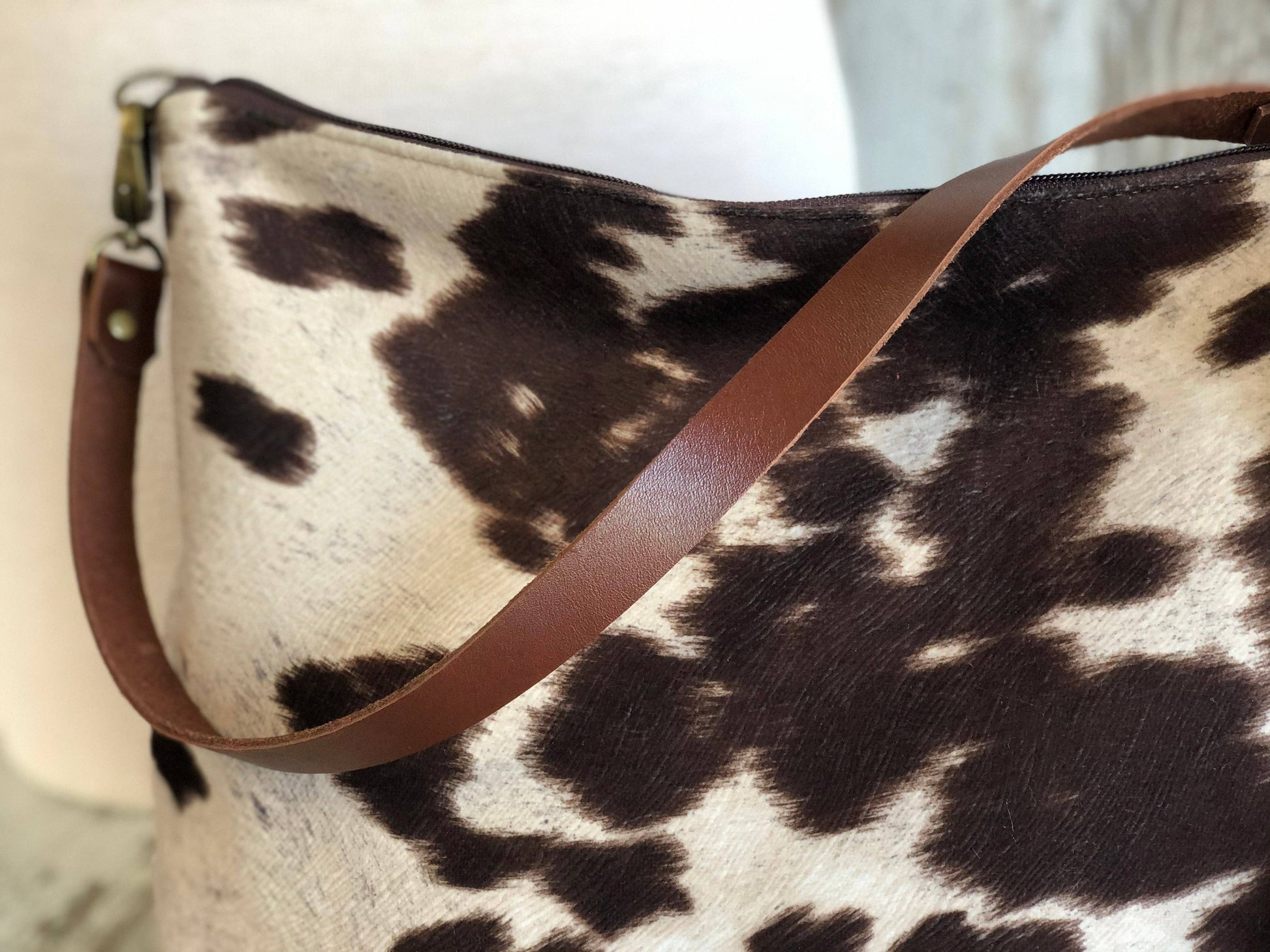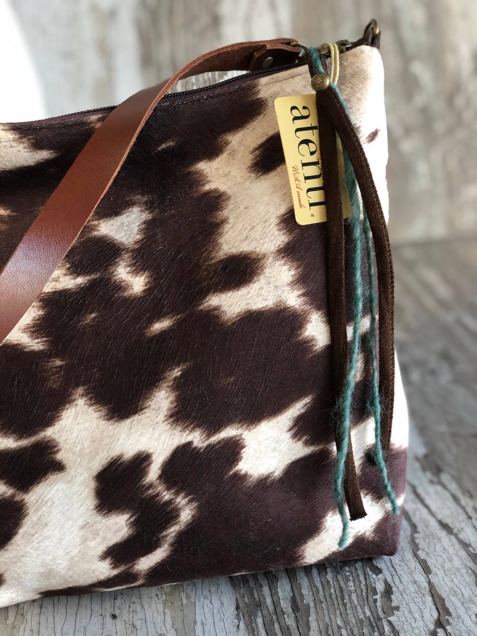 This large pouch has an end to end zipper closure and a detachable leather shoulder strap. Fully lined in our water resistant tan taffeta featuring a zippered pocket and feet.