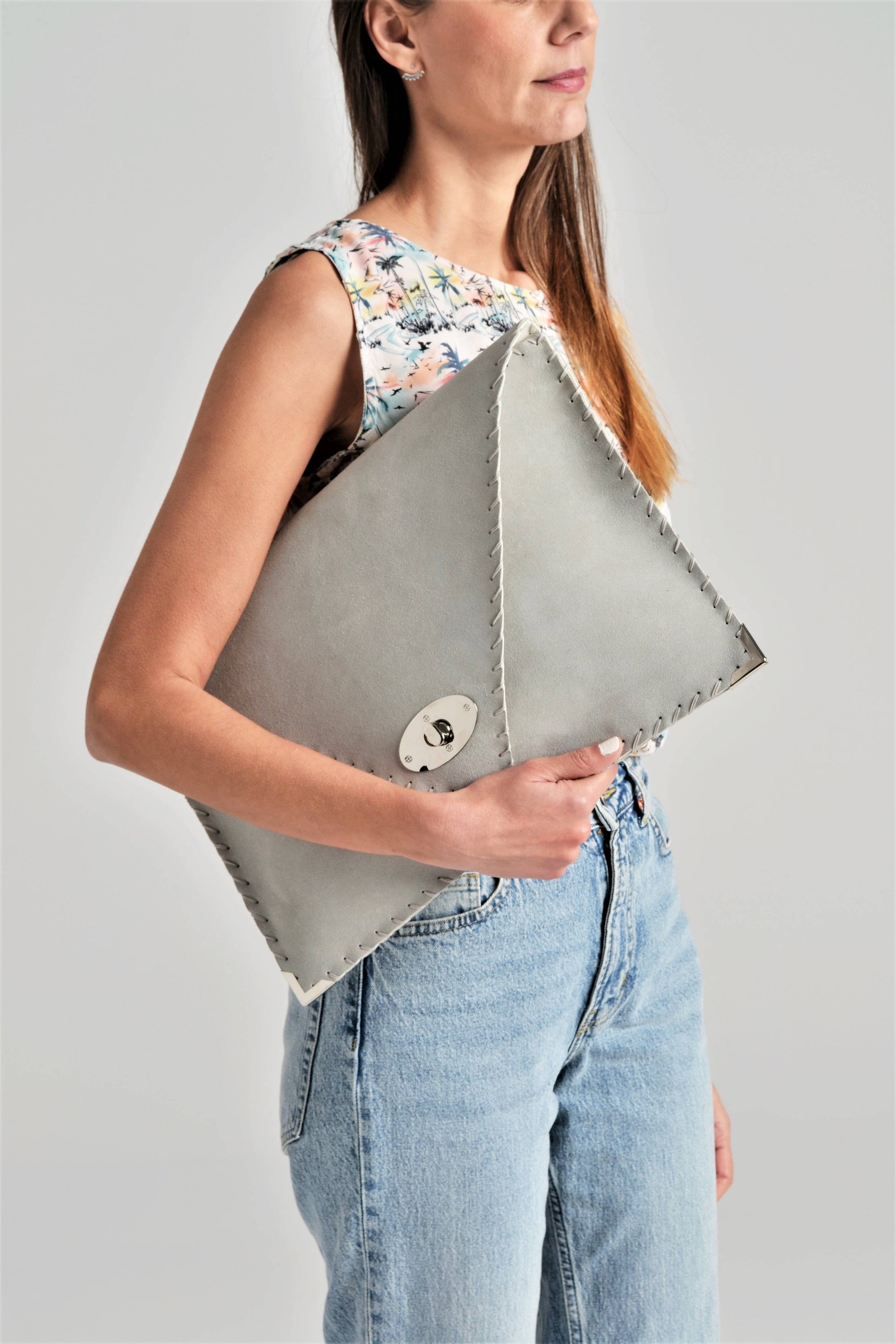 This adorable clutch is handmade out of an Italian suede leather in light gray color.